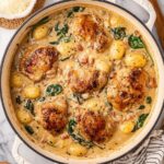 Creamy Chicken and Gnocchi Bake is a comforting one-pan dish featuring tender chicken thighs, pillowy potato gnocchi, and a rich creamy sauce infused with herbs and spinach, all baked to bubbly perfection with Parmesan cheese on top.