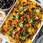 - Add Fresh Toppings: Immediately top the melted nachos with diced cherry tomatoes, sliced black olives, fresh chopped cilantro, jalapeño slices, and green onions.